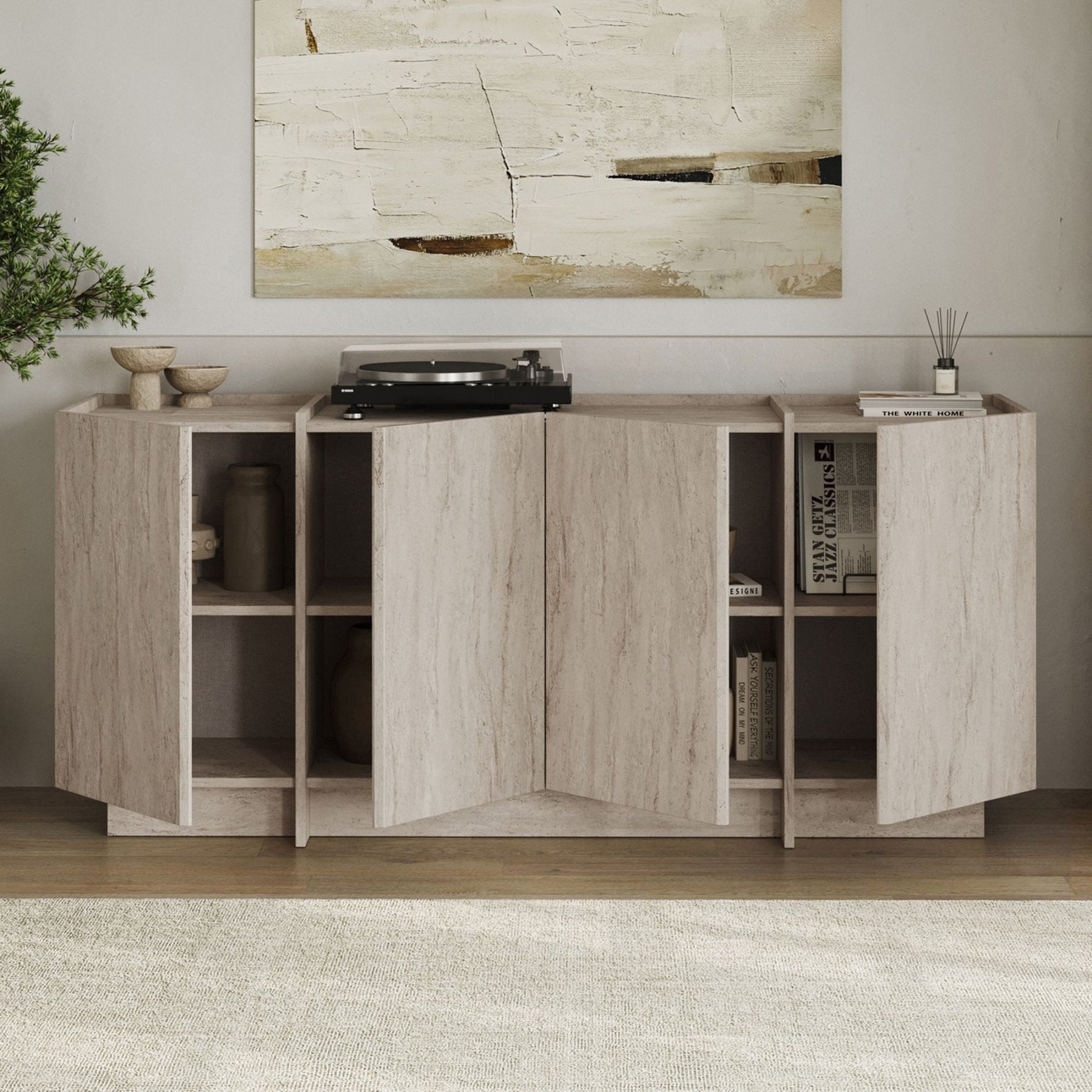 Les teintes beige clair du travertin se marient magnifiquement avec des couleurs sable douces, des tapis clairs et des parquets en chevrons. Que vous placiez le Lowen dans votre salon comme buffet principal ou dans votre entrée comme pièce maîtresse fonctionnelle, il apporte instantanément calme et harmonie à votre foyer.