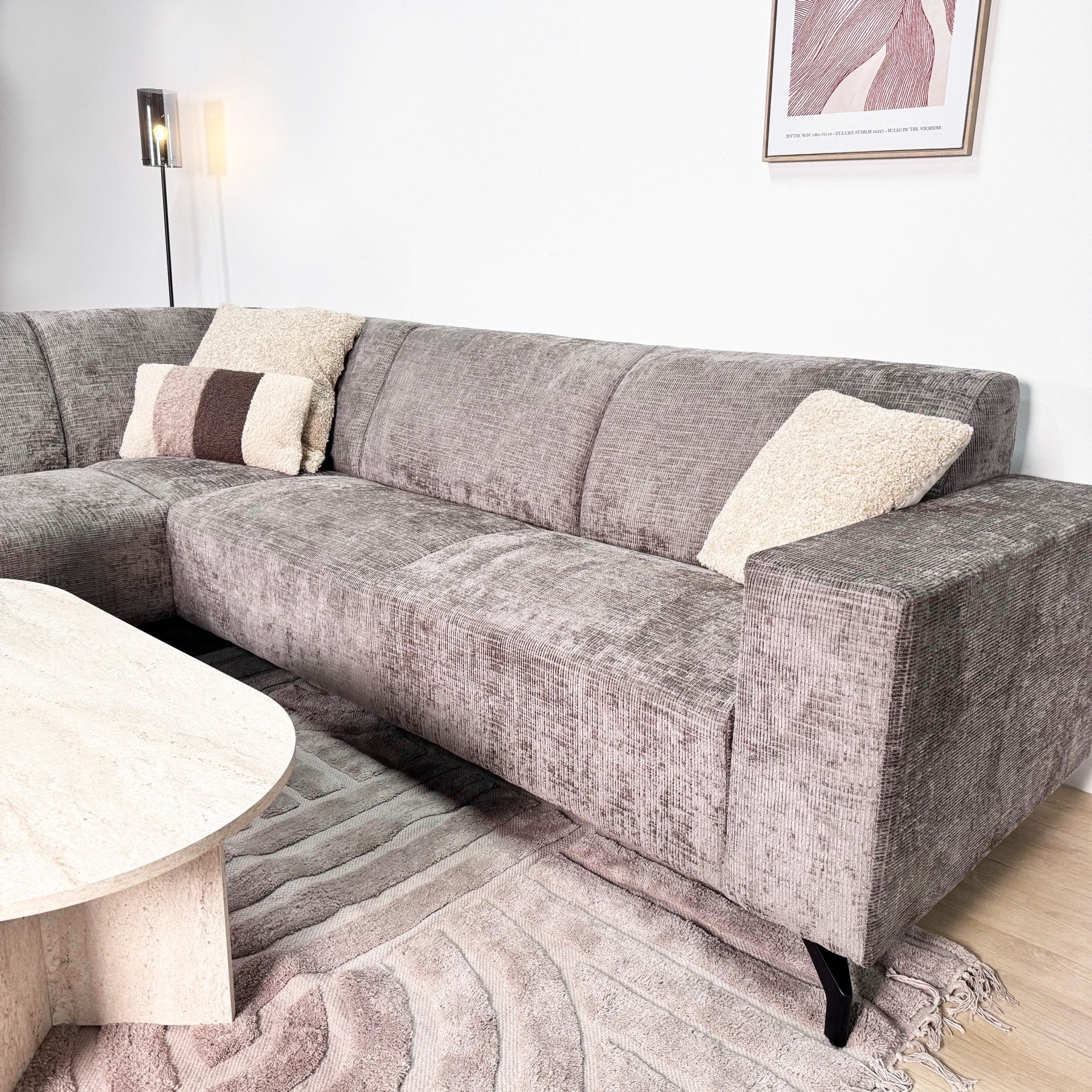 Ce canapé d'angle élégant Manon avec chaise longue à gauche en chenille taupe allie confort et durabilité à un design moderne, ce qui en fait une pièce maîtresse dans n'importe quel intérieur. Le canapé d'angle est conçu pour être polyvalent et fonctionnel. Les coussins fixes restent toujours en place, ce qui permet au canapé de conserver une apparence soignée et ordonnée. L'espace assis spacieux offre suffisamment de place pour toute la famille ou pour des invités, ce qui en fait l'endroit idéal pour des occasions sociales ou pour se détendre.