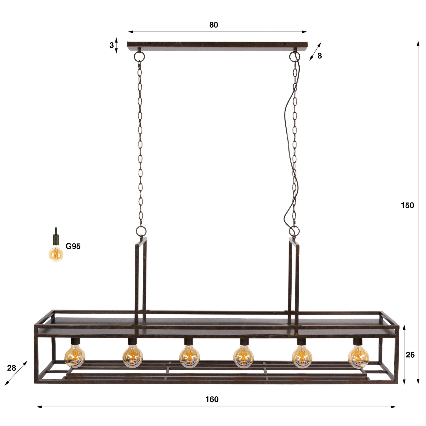 La suspension Eloisa est dotée d'un cadre en métal rectangulaire avec une finition charbon. Les 6 sources de lumière sont suspendues en ligne dans le cadre, ce qui permet d'avoir suffisamment de lumière au-dessus de la table et dans la pièce. Ambiance chaleureuse et efficace. La lampe dispose en effet de chaque côté d'un espace où des verres à vin peuvent être accrochés. De plus, il y a également de la place sur le dessus de la lampe pour y placer des objets. Cette lampe est donc super adaptée au-dessus d'une cuisine ou d'un bar. Il est recommandé d'utiliser une source de lumière LED.