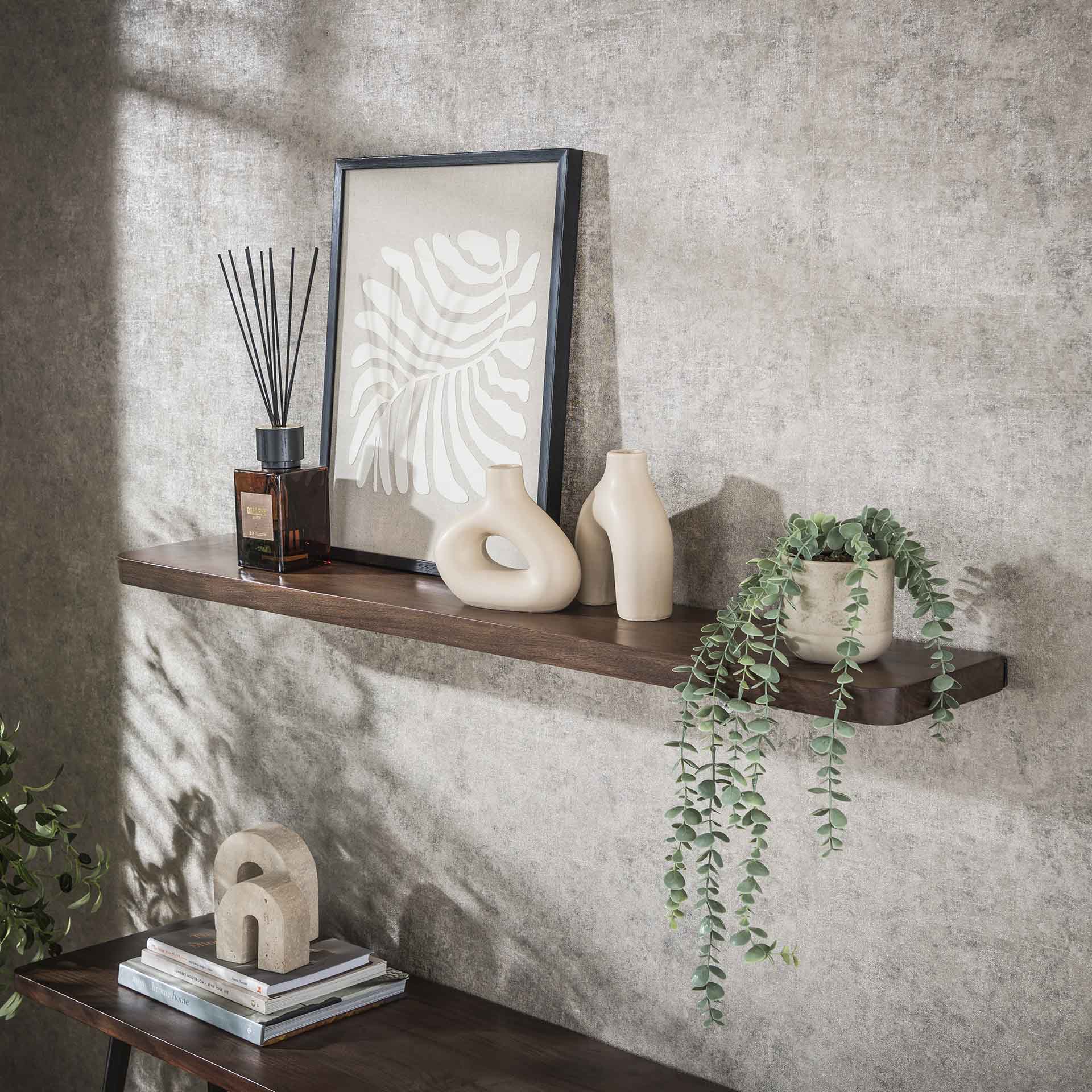 Créez une ambiance supplémentaire et un espace de rangement avec cette étagère murale en bois massif d'acacia, finition drift brown élégante. Le grain naturel et la teinte chaude confèrent à chaque pièce un look raffiné et industriel. Avec une longueur de 120 cm, c'est l'étagère parfaite pour vos plantes préférées, livres ou décorations dans le salon, le hall ou la cuisine.
