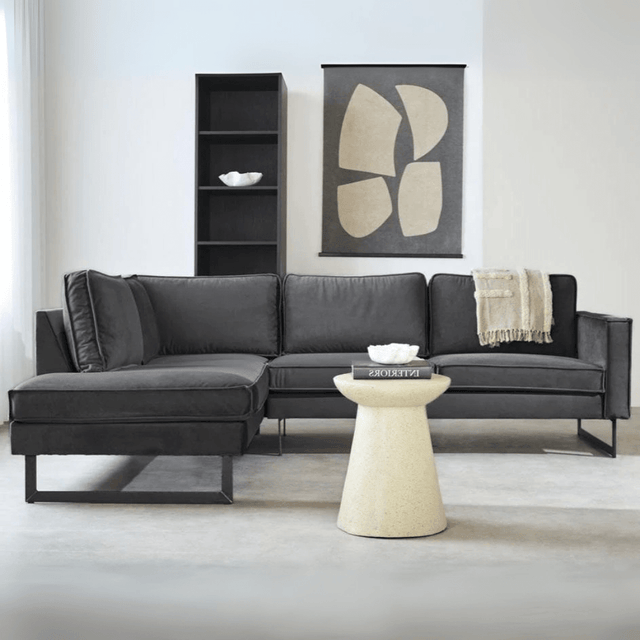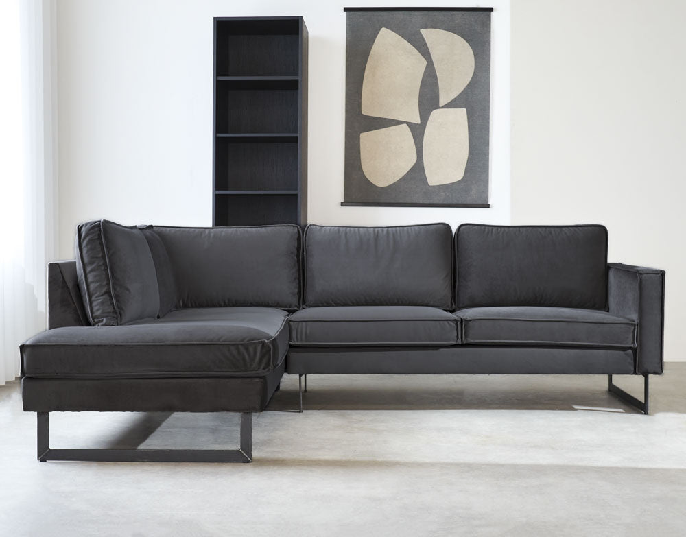 Le canapé d'angle Quinn est un ajout précieux à tout intérieur. Le canapé d'angle est très confortable, élégant et industriel grâce à la combinaison des pieds en métal noir et du velours mat. Les canapés en velours se marient bien avec différents matériaux et styles d'intérieur et créent en outre une atmosphère chaleureuse. Le canapé d'angle Quinn dispose de larges sièges où plusieurs personnes peuvent s'asseoir facilement.