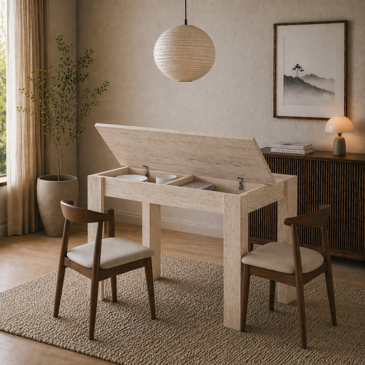 Ce qui distingue vraiment cette table, c’est l’espace de rangement intégré sous le plateau. Parfait pour ranger sets de table, vaisselle ou autres objets que vous souhaitez garder à portée de main, sans créer de désordre visuel.