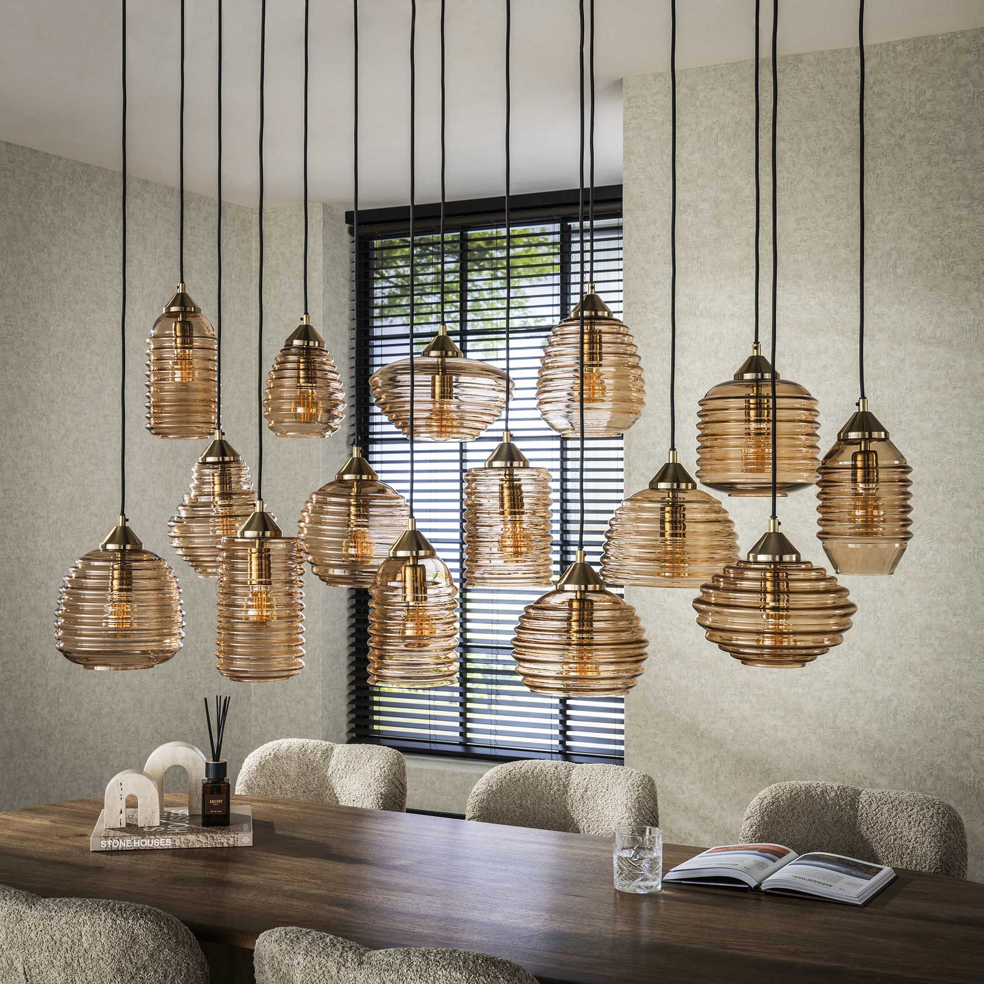 Suspension Mali 15 lumières verre nervuré couleur ambre