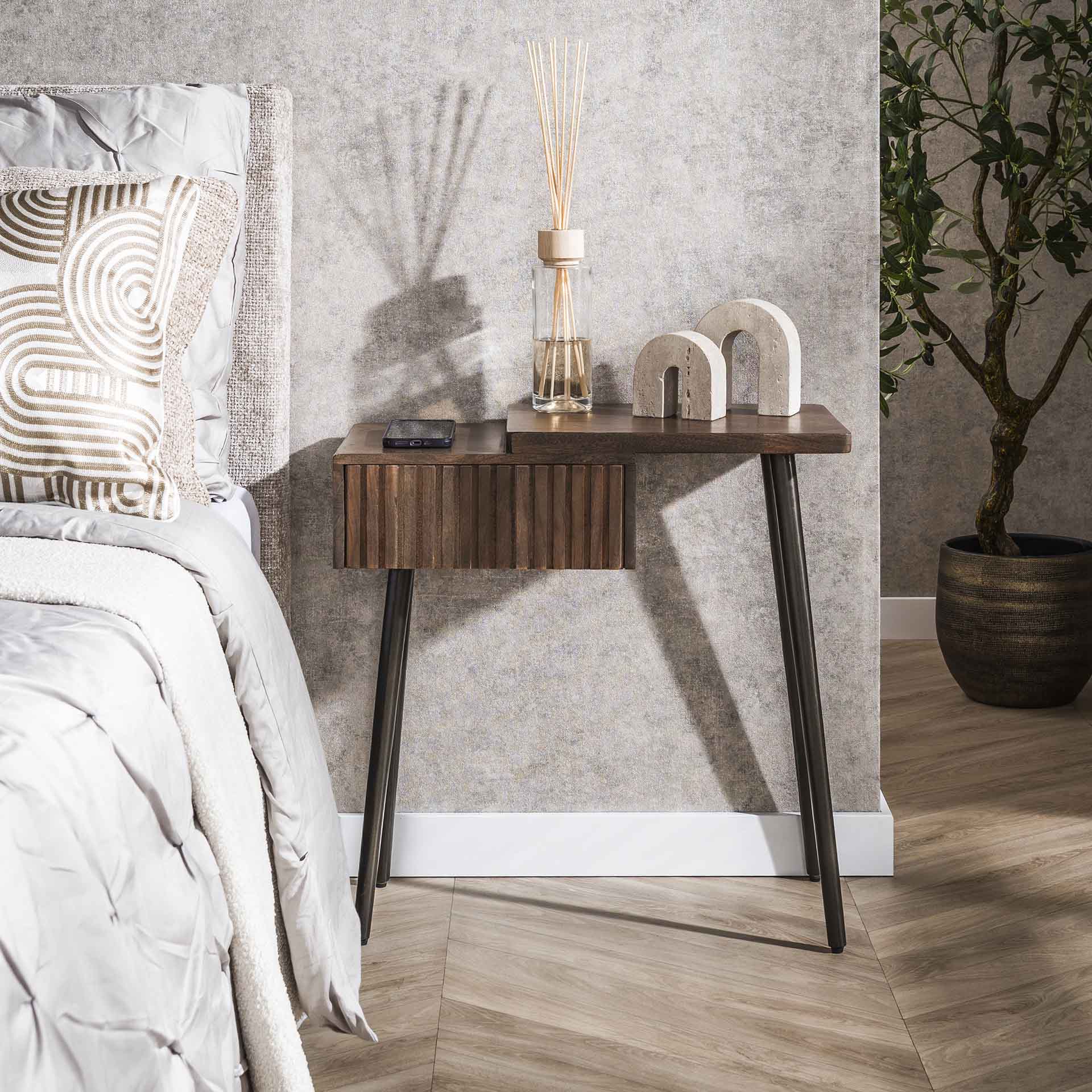 Description et spécifications de Table de chevet Oslo Droite - Acacia massif Drift Brown (1 tiroir)