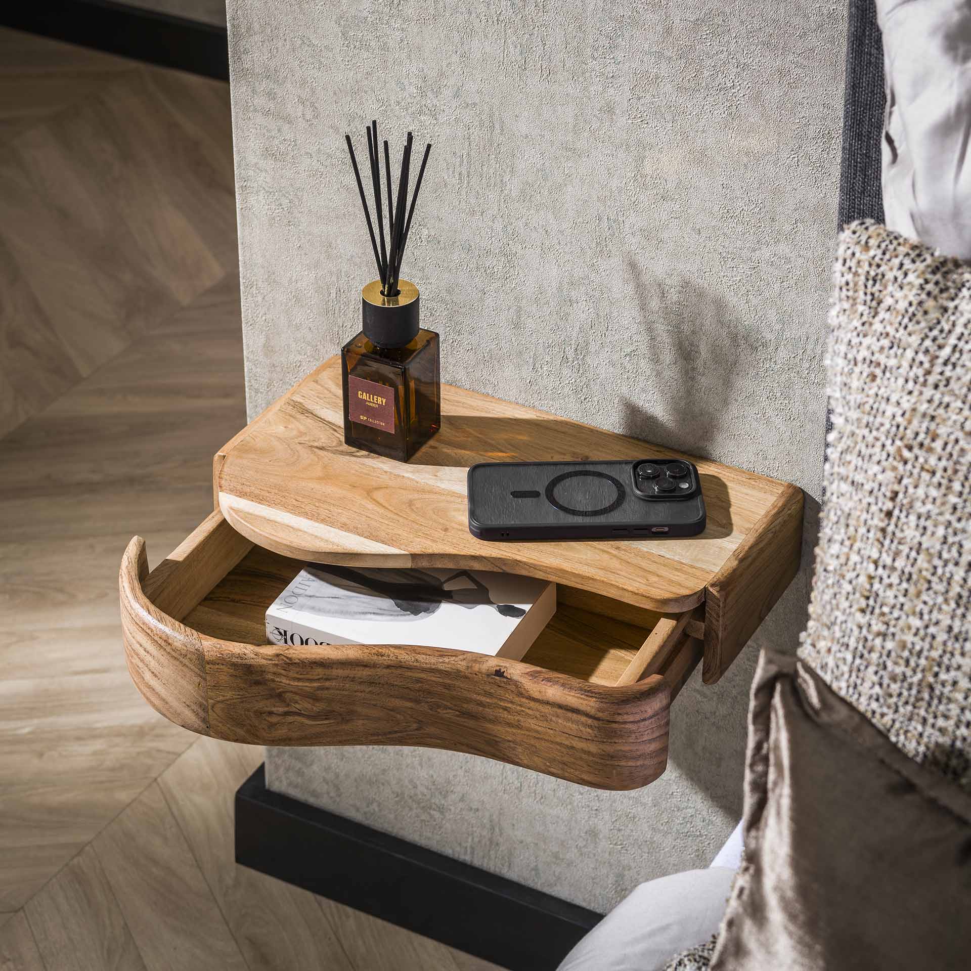 Complétez votre chambre avec les tables de chevet murales Nova, livrées par lot de 2 en version gauche et droite. Ces tables de chevet flottantes sont fabriquées en bois d'acacia massif avec un magnifique bord organique qui met en valeur le grain naturel du bois. Grâce à leur format compact, vous créez un espace de rangement pratique à côté de votre lit sans perdre de surface au sol. Parfait à combiner avec des intérieurs modernes, industriels et scandinaves.